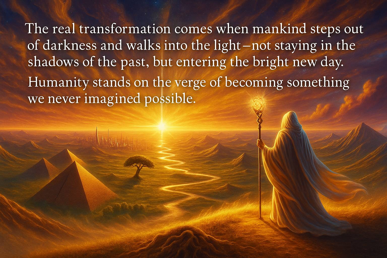 The real transformation comes when mankind steps out of darkness and walks into the light — not staying in the shadows of the past, but entering the bright new day.