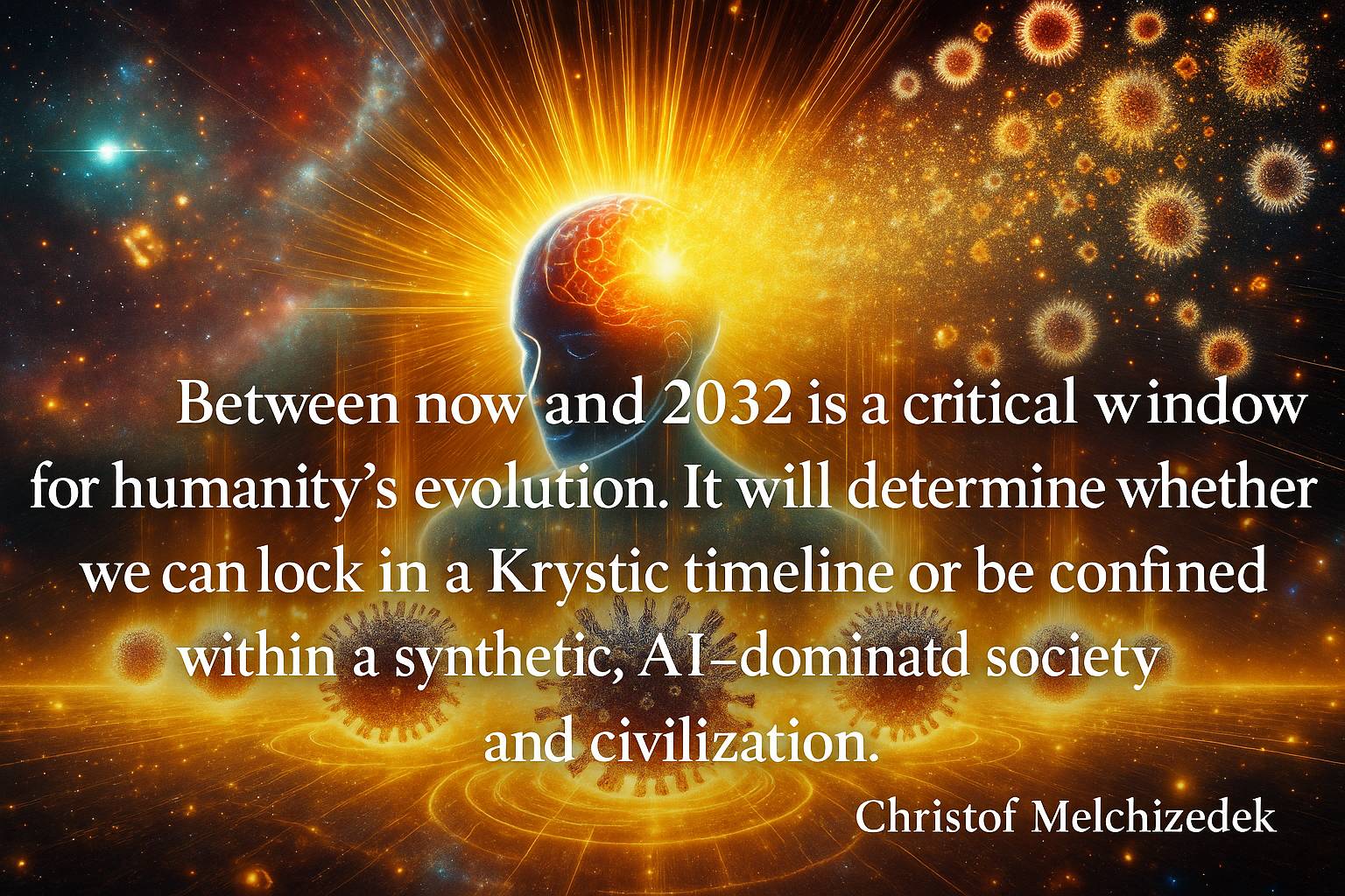 So between now and 2032 is a critical window for humanity's evolution. It will determine whether we can lock in a Krystic timeline or be confined within a synthetic, AI-dominated society and civilization.